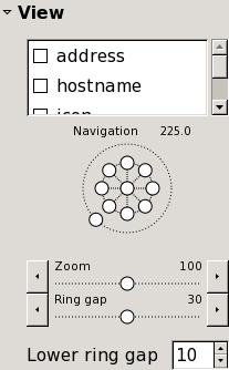 Zoom and Ring gap both control the overall size of the graph. Zoom changes the size of everything—hosts, labels, connecting lines. Ring gap just increases the spacing between the concentric rings, keeping everything else the same size. Lower ring gap gives a minimum spacing for the rings, useful mainly when fisheye is enabled.